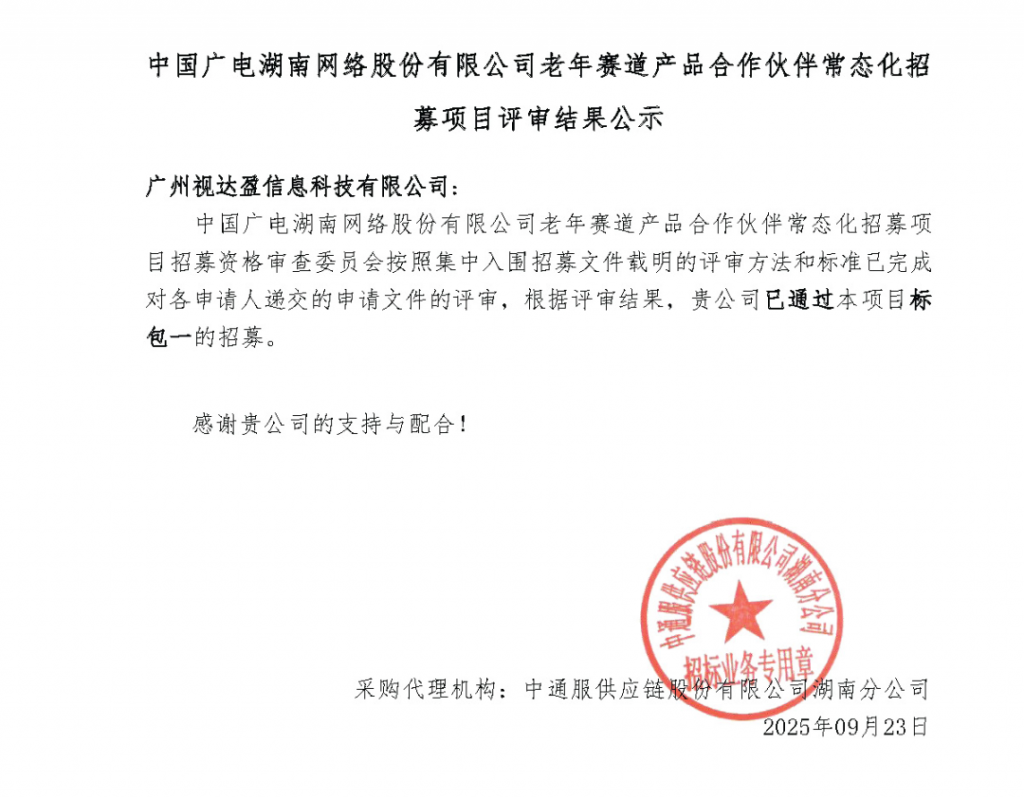 视达盈科技继年初与广东省广播电视网络股份有限公司达成政企业务合作伙伴关系、与中国广电重庆公司达成多项业务合作伙伴关系后,近日再创佳绩,与中国广电湖南公司达成养老业务合作伙伴关系,在智慧养老、智慧康养等多个业务板块展开合作。此次入围是中国广电湖南公司对视达盈科技项目经验、技术研发、产品运营、客户服务等综合能力深入考察与评估后的充分肯定。